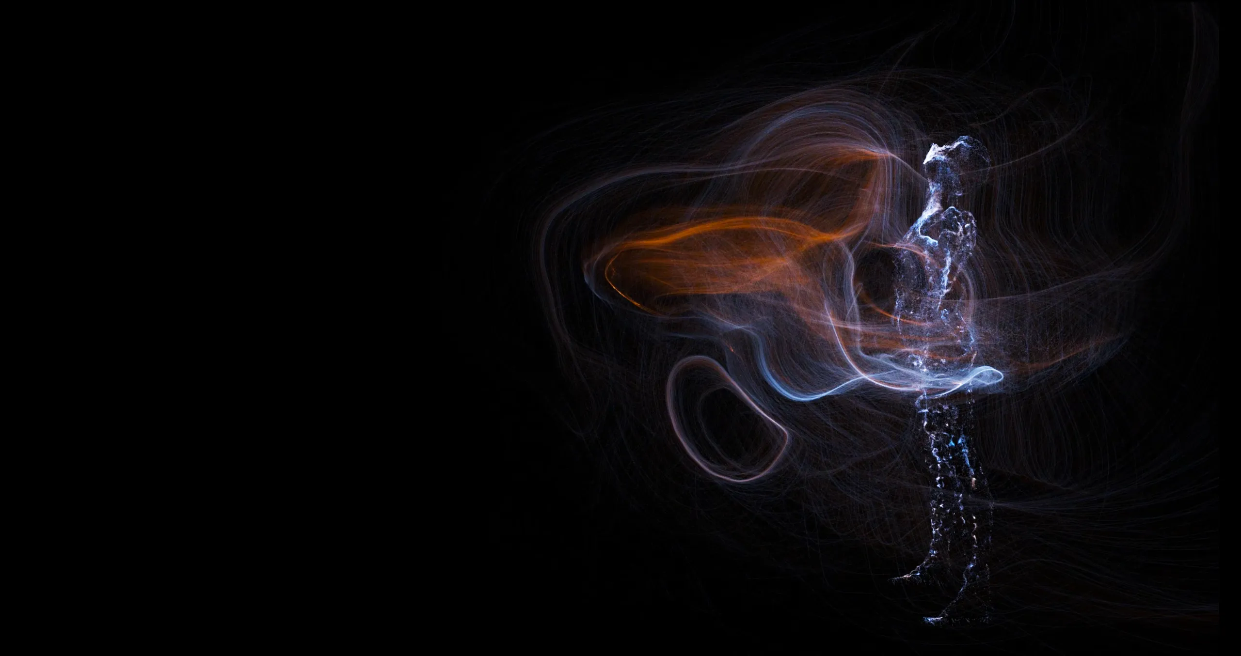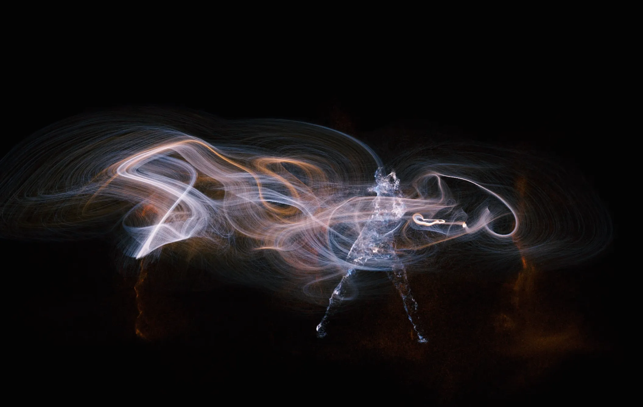 The past, present and future of the dancer's movements are imprinted onto a 4D field, an invisible dense stage of forces that drive a particle-based chaotic dance.