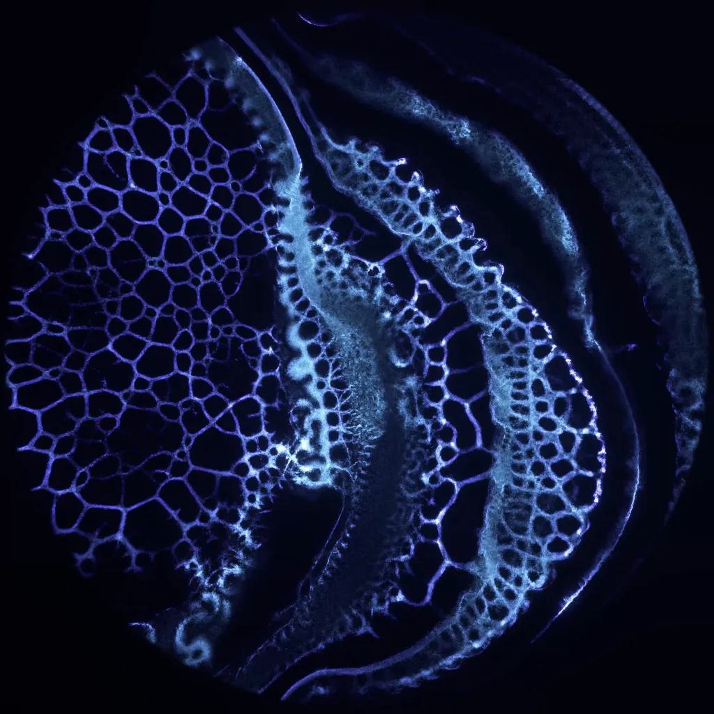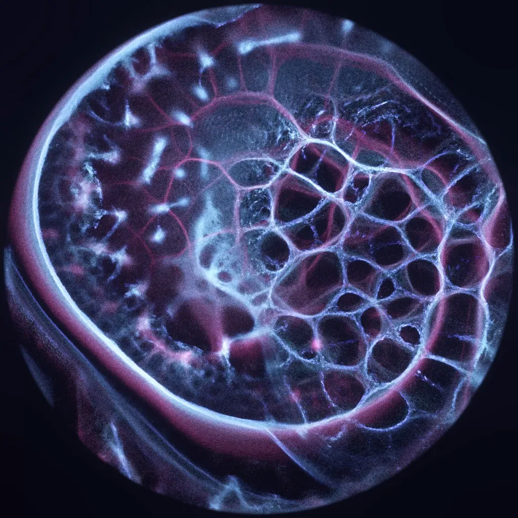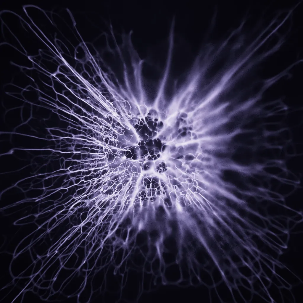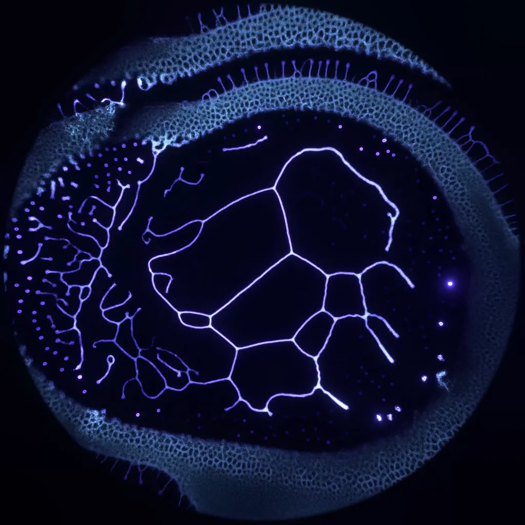 We were inspired equally by the intricate micro-structures of biological cells, as well as their interaction with photons and how light travels through them and changes their molecular structure. We developed a digital petri dish that cultivated a Physarum Polycephalum, shifting and rearranging itself in response to the dancer's movement as well as the beat of the music.