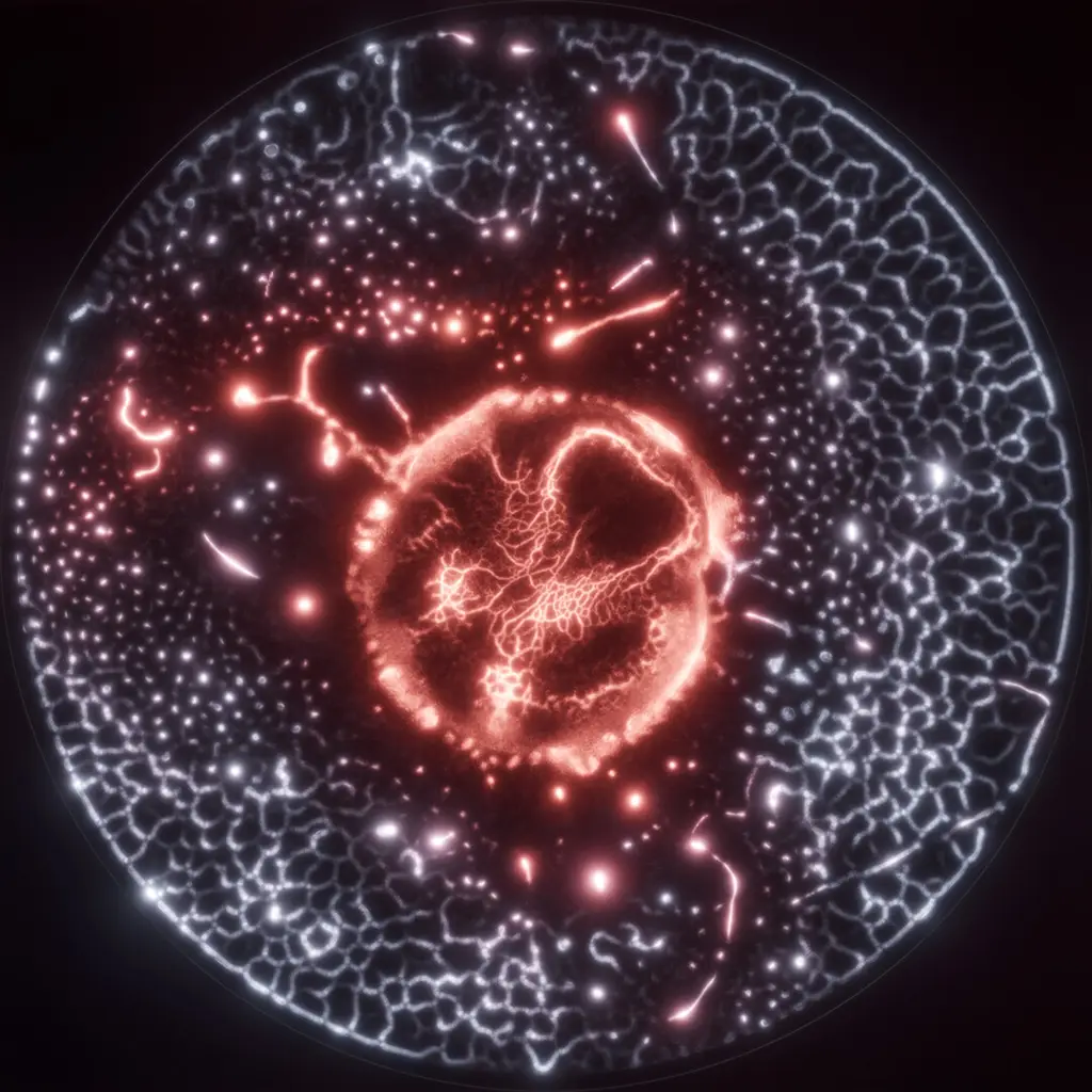 Inside a vast virtual petri dish, shaped by invisible swirling currents of nutrients, an emergent organism inspired by the slime-mold Physarum polycephalum, wrestles with the pull of its programmed instincts and the shifting forces of a responsive, ever-changing environment. Its form reconfigures in turbulent cycles of Birth, Destruction, and Resurrection that echo the rhythms of nature’s chemistry and humanity’s oldest myths.